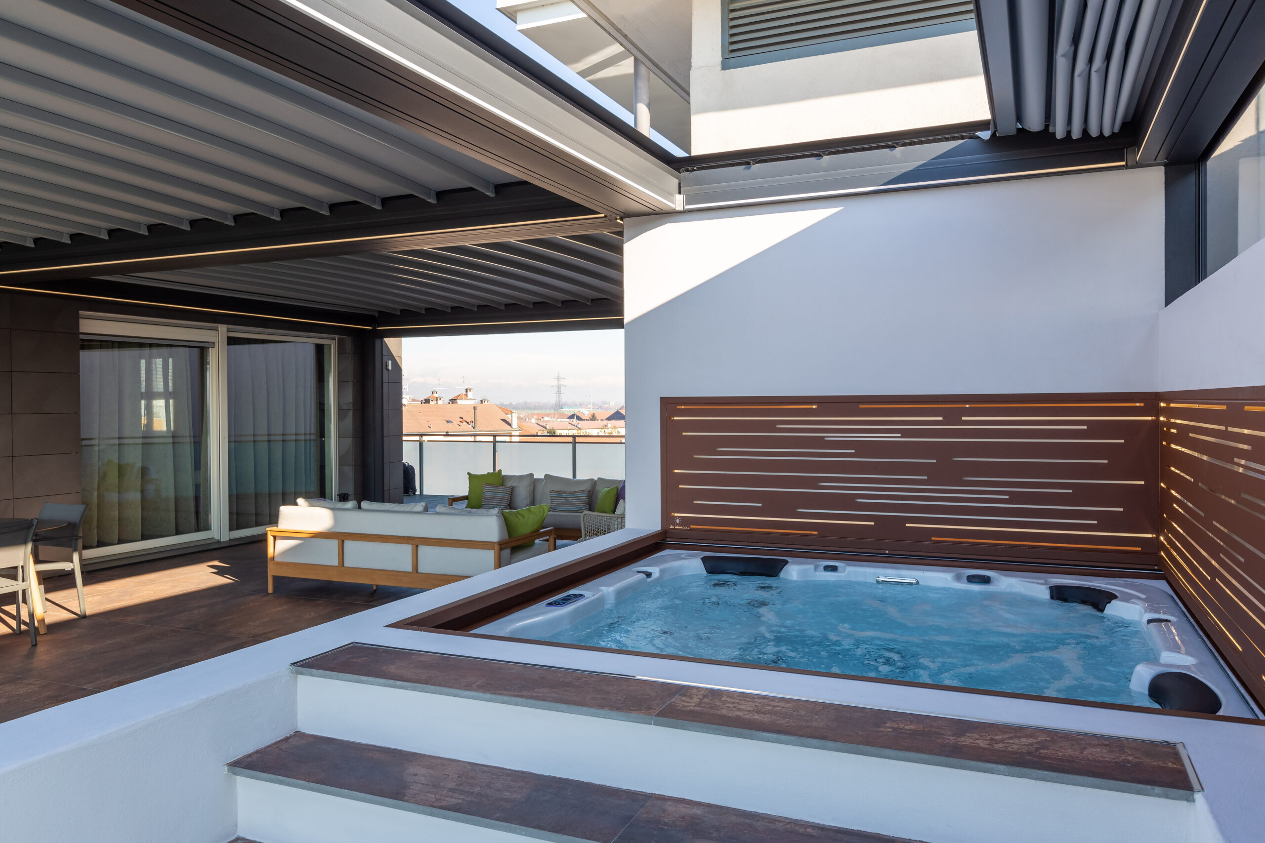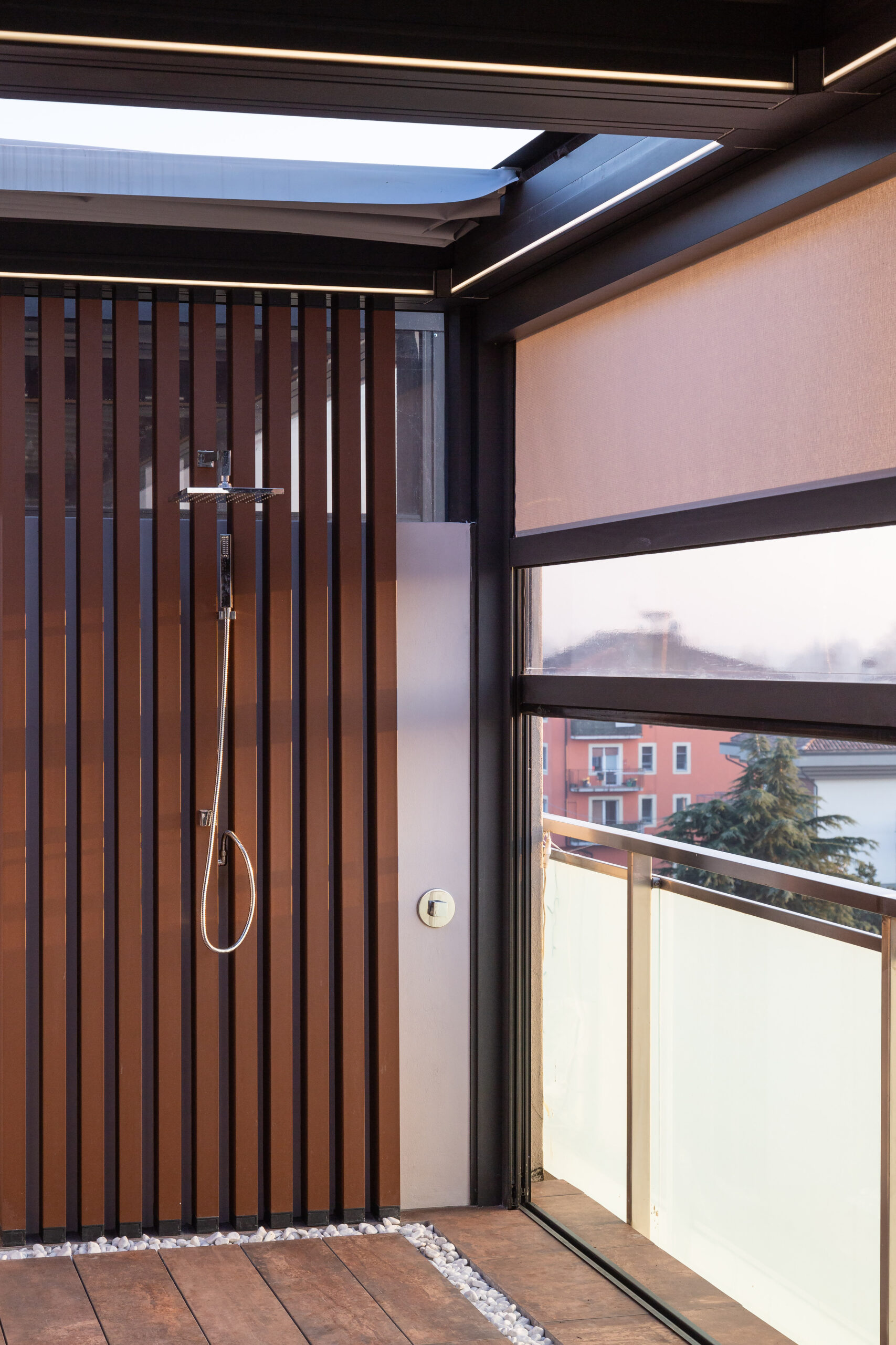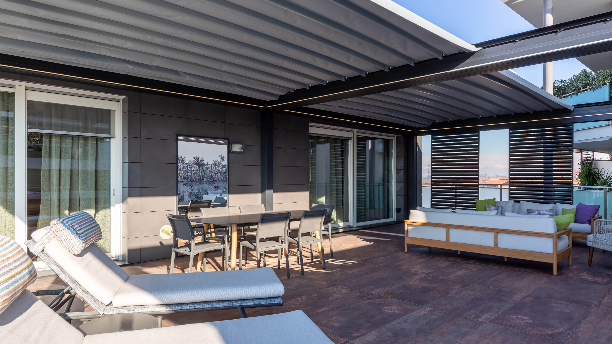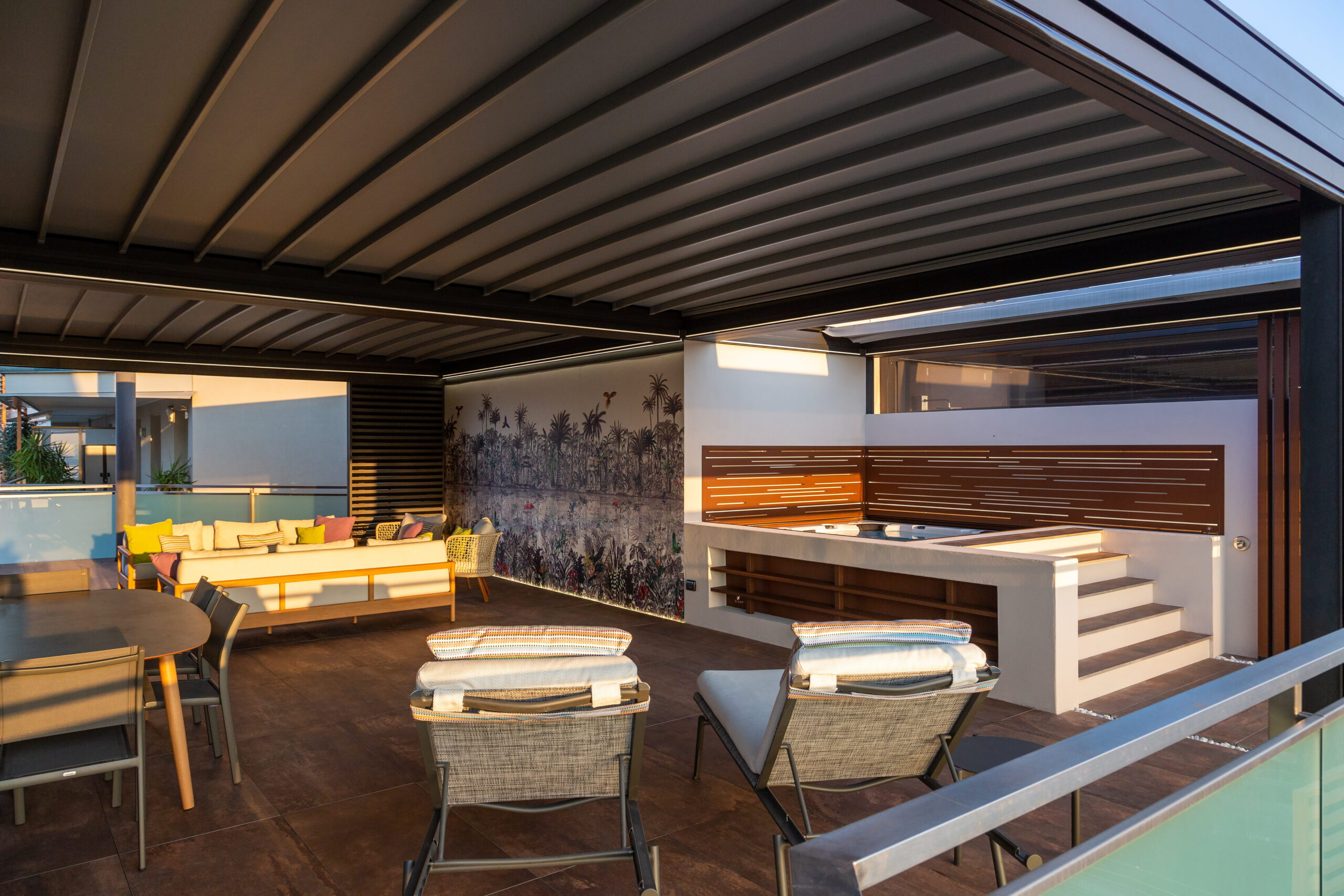 Un coin de pur bien-être capable de faire dialoguer les espaces intérieurs et extérieurs du toit terrasse. La polyvalence et les personnalisations des produits KE ont permis de créer un projet personnalisé avec un caractère unique.
